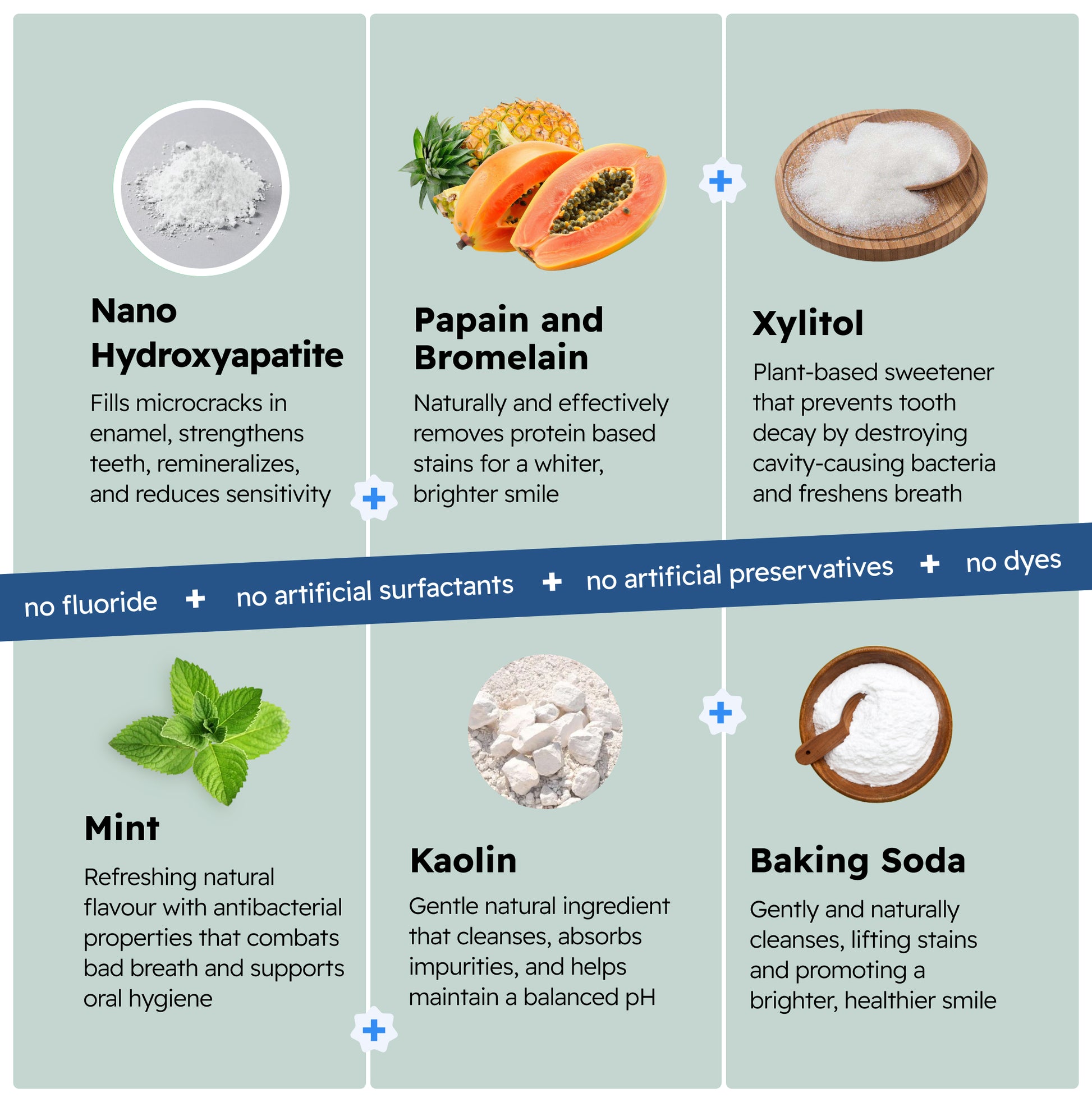Calcium Carbonate, Sodium Bicarbonate (Baking Soda), Kaolin, Phthalimidoperoxycaproic Acid (PAP), Nano-Hydroxyapatite, Xylitol, Coco-Glucoside, Papain, Bromelain, Peppermint Oil, Spearmint Oil.